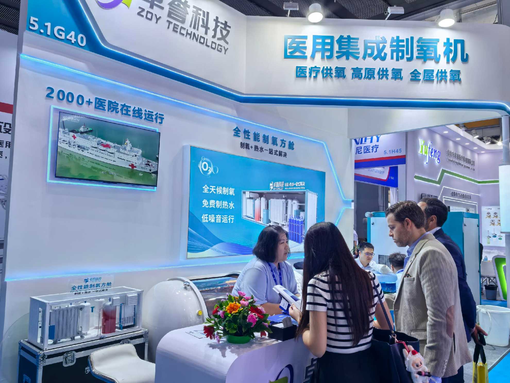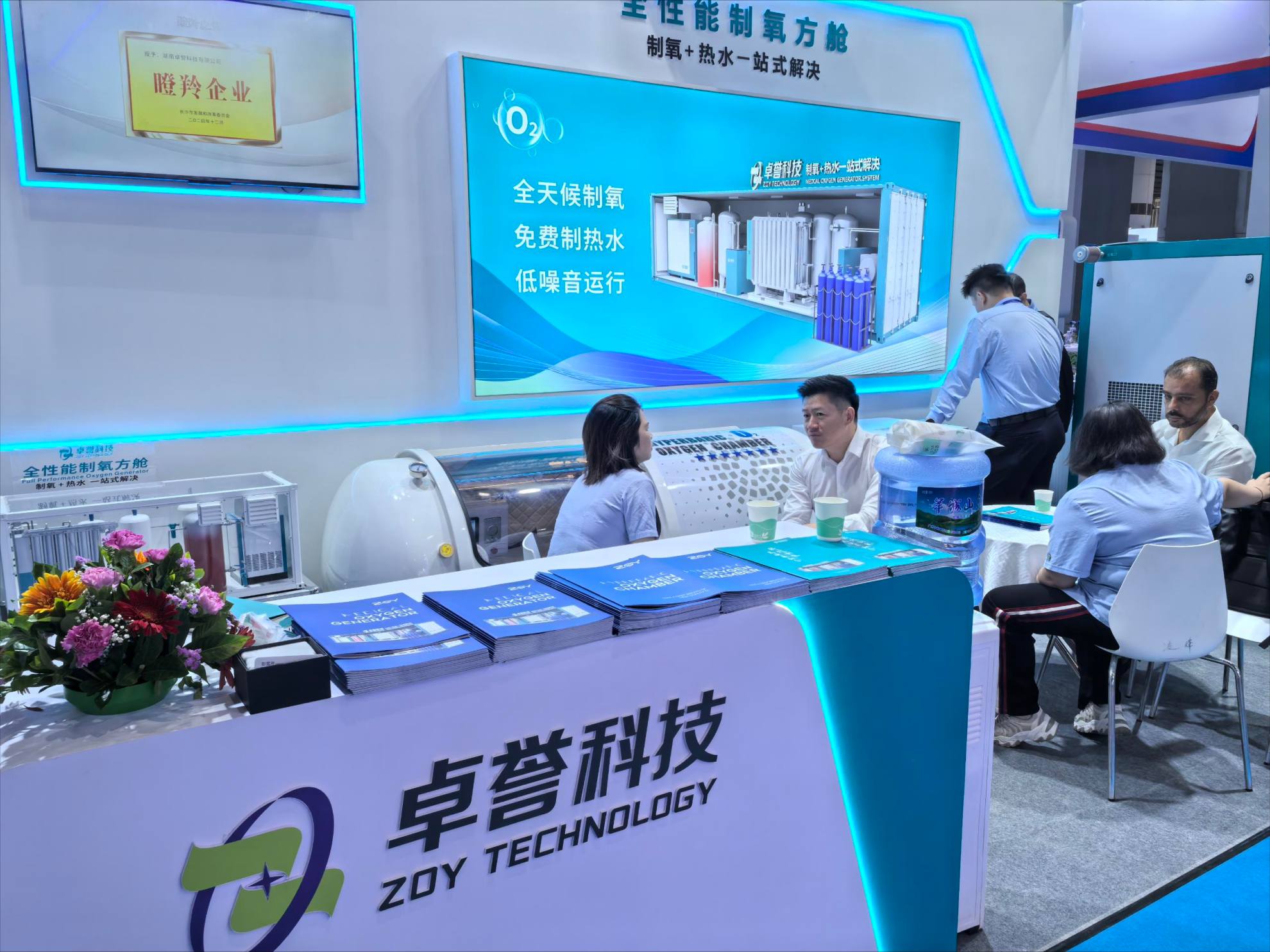 卓誉不仅展出全性能制氧热水一体化解决方案,更带来多款创新产品的现场“首秀”。其中,3立方集成医用制氧机设备,制氧热水一体化,现场开机演示,以及专为海外市场打造的专业版氧舱体验区,成为全场关注焦点。