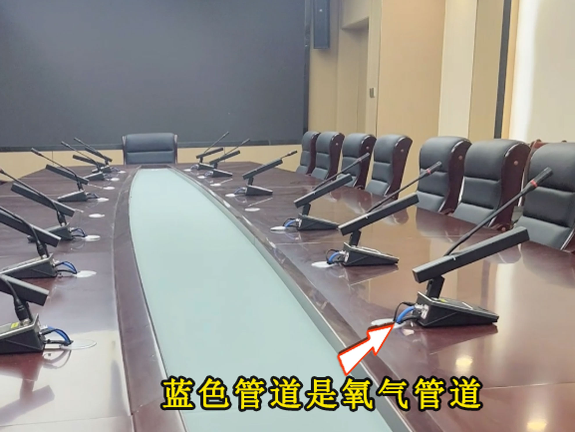 第二套系统则是卓誉独创的桌面话筒供氧系统,体现了功能与设计的巧妙融合。该会议室配备了14个话筒,连接话筒的蓝色管道实则为氧气输送管道,这一创新设计将供氧功能与会议设备无缝对接。尤为贴心的是,桌面话筒供氧系统的出氧口具备灵活调节功能,经过反复测试与优化,确保了开会时讲话声音与氧气出氧声音互不干扰。这一设计既保障了沟通的清晰度,又让每位发言者在畅所欲言的同时,精准获取所需氧气,实现呼吸与表达的和谐统一。