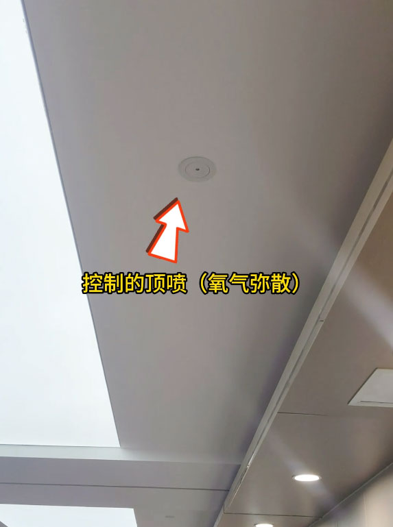 第一套系统为终端控制的顶喷(氧气弥散)终端,该会议室共配备了六个顶喷设备,能够均匀覆盖整个会议空间。通过弥散式供氧技术,室内氧气浓度被精准维持在舒适区间,无需参会人员手动操作,即可在会议全程沉浸于富氧环境,享受清新呼吸。