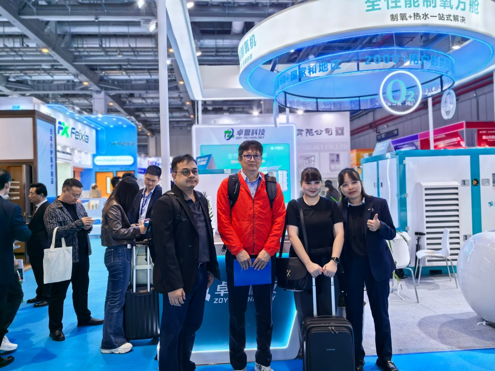 展位现场科技感与专业感十足,吸引了国内外众多参展商、医疗机构代表及行业专家驻足咨询、洽谈合作。卓誉展位人气持续高涨,工作人员热情为每一位来访者讲解制氧产品的优势与应用场景——从医院中心供氧系统的整体解决方案,到康养场景的制氧系统,再到制氧+热水+光伏一体化的创新节能供氧方案,全方位满足不同客户的多元化需求。此外,卓誉产品出口全球60余个国家和地区、服务超2000家用户的亮眼成绩,更彰显了其全球化实力与市场认可度。