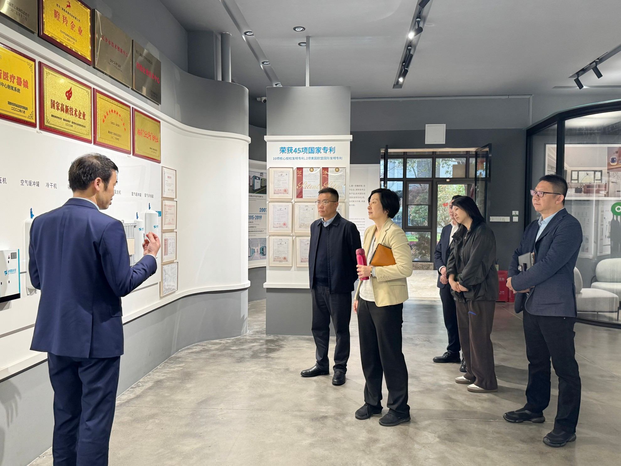 考察伊始,湖南卓誉科技有限公司董事长黄刚携核心团队热情迎接。考察团先后走进卓誉展厅与生产车间,详细了解企业发展历程、核心技术储备及产品研发成果,包括制氧、热水、光伏一体化节能解决方案,并近距离观摩了全性能制氧热水一体化方舱、集成制氧系统等设备。卓誉深耕制氧领域十余年,已在医用、民用、高原、海外、军用及智慧设施渔业装备领域形成核心技术优势,其创新成果赢得考察团高度评价,民用全屋供氧技术更引发大家浓厚兴趣。