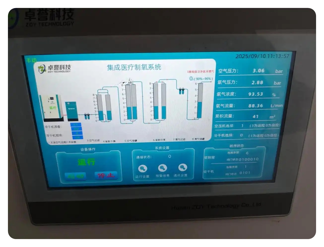 卓誉为达日县人民医院安装的2台5立方集成式中心制氧系统,采用变压吸附技术,以空气为原料,持续稳定地输出浓度高达93%±3%的医用氧气,有效满足住院部、手术室等不同区域的氧气需求。