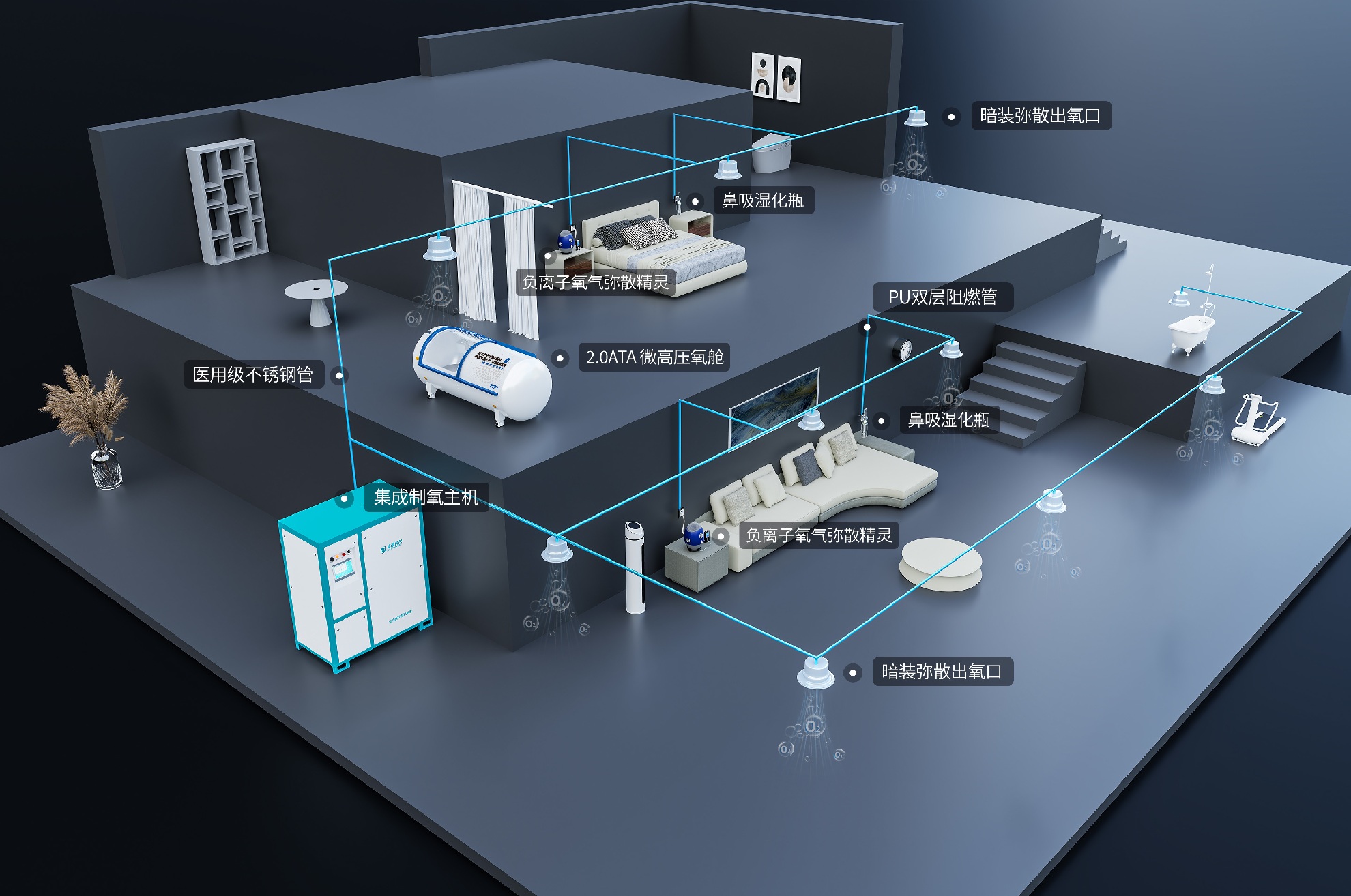 中心供氧技术如何从医院走进我们的日常生活?随着科技的不断进步和健康意识的日益增强,中心供氧技术被创新性地应用于非医疗领域,即“富氧工程”、“全屋弥散供氧系统”,成为健康生活的“新风尚”。这一技术主要服务于对生活品质有高要求的人群,同时为高原地区的旅客和常住居民营造出舒适的“仿平原”环境。它通过在特定空间人为提高封闭空间中的氧气含量,使氧气触手可及,达到类似富氧森林的环境,缓解因密闭环境或高原缺氧引起的不适。