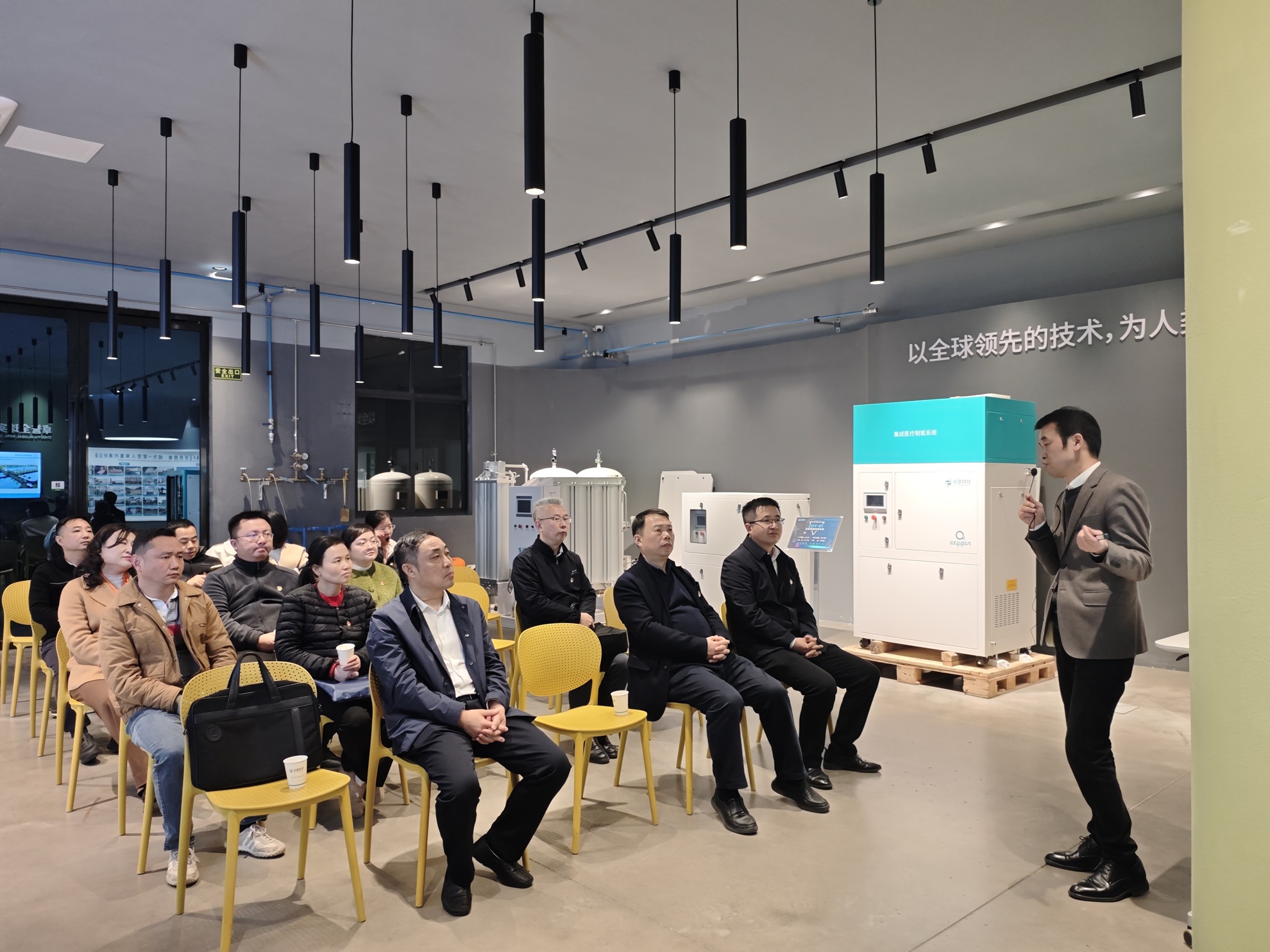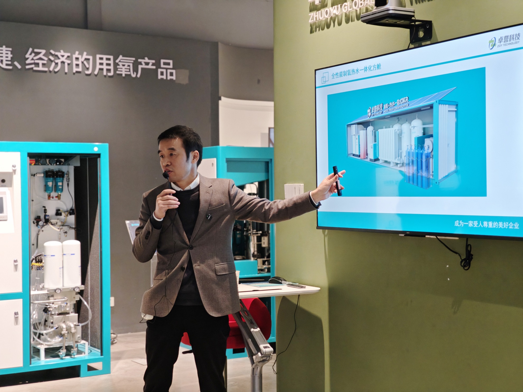 在参观过程中,黄刚董事长结合企业发展的实际情况,详细阐述了卓誉在制氧领域深耕十载的成长历程:从成立初期专注于技术突破,到如今具备全场景服务能力,布局医用、民用、高原、海外、军用、智慧渔业六大板块,在制氧赛道上稳步推进。