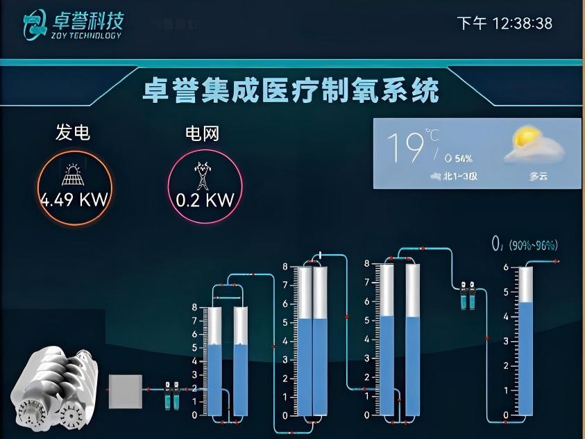 卓誉创新地将光伏发电与医疗级制氧技术深度融合。太阳能直接驱动制氧机设备运行;夜间或阴雨天,系统无缝切换至市政供电。智能控制系统就像一位“能源管家”,实时监测光伏发电量、供氧设备能耗与碳减排数据,确保供氧从未间断,成本可控。